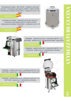 Centrifuga per insalata - Mod. ES100 - Capacità di carico per ciclo kg 6 - Produzione oraria Kg/ora 120/360 - Potenza W 550 - Alimentazione monofase V230/1/50Hz - Dimensioni cm 54 x 75 x 66.5 h SAM-ES100 Centrifuga per insalata - Capacità di carico per ciclo kg 12 - Produzione oraria Kg/ora 240/720 - Potenza W 550 - Alimentazione monofase V230/1/50Hz - Dimensioni cm 54 x 75 x81.5 h SAM-ES200 Pelapatate - capacità carico kg 5 - produzione Kg/h 60 - Cm ATTREZZATURE CUCINA 63x52x59h - potenza hp 0.5 - alimentazione trifase - peso Kg 26 FIR-PPN5-T Pelapatate - capacità carico kg 5 - produzione Kg/h 60 - Cm 63x52x59h - potenza hp 0.5 - alimentazione monofase - peso Kg 26 FIR-PPN5-M Pelapatate - capacità carico kg 10 - produzione Kg/h 120 - Cm 40x77x86h - potenza hp 1 - alimentazione trifase - peso Kg 37 FIR-PPN10M-T Pelapatate - capacità carico kg 10 - produzione Kg/h 120 - Cm 40x77x86h - potenza hp 1 - alimentazione monofase - peso Kg 37 FIR-PPN10M-M 5