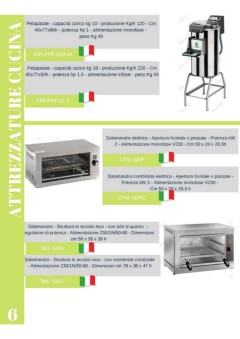 Pelapatate - capacità carico kg 10 - produzione Kg/h 120 - Cm ATTREZZATURE CUCINA 40x77x86h - potenza hp 1 - alimentazione monofase - peso Kg 40 FIR-PPF10M-M Pelapatate - capacità carico kg 18 - produzione Kg/h 220 - Cm 40x77x93h - potenza hp 1.5 - alimentazione trifase - peso Kg 43 FIR-PPF18-T Salamandra elettrica - Apertura frontale o passate - Potenza kW 2 - Alimentazione monofase V230 - Cm 50 x 28 x 26.5h CFM-SEP Salamandra combinata elettrica - Apertura frontale o passate - Potenza kW 3 - Alimentazione monofase V230 - Cm 50 x 28 x 26.5 h CFM-SEPC Salamandra - Struttura in acciaio inox - con tubi al quarzo - regolatore di potenza - Alimentazione 230/1N/50-60 - Dimensioni cm 56 x 36 x 39 h TKL-SM2 Salamandra - Struttura in acciaio inox - con resistenze corazzate - Alimentazione 230/1N/50-60 - Dimensioni cm 76 x 36 x 47 h TKL-SM3 6