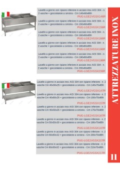 Lavello a giorno con ripiano inferiore in acciaio inox AISI 304 - n. 2 vasche + gocciolatoio a sinistra - Cm 140x60x85h PUG-LGE2VGSX146R Lavello a giorno con ripiano inferiore in acciaio inox AISI 304 - n. 2 vasche + gocciolatoio a sinistra - Cm 150x60x85h PUG-LGE2VGSX156R Lavello a giorno con ripiano inferiore in acciaio inox AISI 304 - n. 2 vasche + gocciolatoio a sinistra - Cm 160x60x85h PUG-LGE2VGSX166R Lavello a giorno con ripiano inferiore in acciaio inox AISI 304 - n. 2 vasche + gocciolatoio a sinistra - Cm 180x60x85h PUG-LGE2VGSX186R Lavello a giorno con ripiano inferiore in acciaio inox AISI 304 - n. 2 vasche + gocciolatoio a sinistra - Cm 190x60x85h PUG-LGE2VGSX196R ATTREZZATURE INOX Lavello a giorno con ripiano inferiore in acciaio inox AISI 304 - n. 2 vasche + gocciolatoio a sinistra - Cm 200x60x85h PUG-LGE2VGSX206R Lavello a giorno in acciaio inox AISI 304 con ripiano inferiore - n. 2 vasche Cm 40x50x25 + gocciolatoio a sinistra - Cm 140x70x85h PUG-LGE2VGSX147R Lavello a giorno in acciaio inox AISI 304 con ripiano inferiore - n. 2 vasche Cm 40x50x25 + gocciolatoio a sinistra - Cm 150x70x85h PUG-LGE2VGSX157R Lavello a giorno in acciaio inox AISI 304 con ripiano inferiore - n. 2 vasche Cm 40x50x25 + gocciolatoio a sinistra - Cm 170x70x85h PUG-LGE2VGSX167R Lavello a giorno in acciaio inox AISI 304 con ripiano inferiore - n. 2 vasche Cm 50x50x30 + gocciolatoio a sinistra - Cm 180x70x85h PUG-LGE2VGSX187R Lavello a giorno in acciaio inox AISI 304 con ripiano inferiore - n. 2 vasche Cm 60x50x32 + gocciolatoio a sinistra - Cm 200x70x85h PUG-LGE2VGSX207R Lavello a giorno in acciaio inox AISI 304 con ripiano inferiore - n. 2 vasche Cm 60x50x32 + gocciolatoio a sinistra - Cm 210x70x85h 11 PUG-LGE2VGSX217R