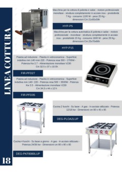 Macchina per la cottura di polenta e salse - motore professionale monofase - struttura completamente in acciaio inox - produttività 7 Kg - consumo 1100 W - peso 25 Kg - dimensioni Cm 21x65x59h HYP-P5 LINEA COTTURA Macchina per la cottura automatica di polenta e salse - motore professionale - monofase - struttura completamente in acciaio inox - produttività 15 Kg - consumo 1600 W - peso 29 Kg - dimensioni Cm 25x70x66h HYP-P15 Piastra ad induzione - Piastra in vetroceramica - Superficie induttiva mm 140÷mm 220 - Potenza resa 500 ÷ 2700W - Potenza Kw 2.7 - Alimentazione monofase V230 Cm 32.5 x 37 x 10.5h FIR-PFD27 Piastra ad induzione - Piastra in vetroceramica - Superficie induttiva mm 140÷ 220 - Potenza resa 500 ÷ 3500W - Potenza Kw 3.5 - Alimentazione monofase V230 Cm 34.3 x 44 x 12 h FIR-PFD35 Cucina 2 fuochi - Su base - A gas - In acciaio stilizzato - Potenza 12/18 kw - Dimensioni cm 80 x 45 x 85 DEG-PLOA2LUP Cucina 4 fuochi - Su base a giorno - A gas - In acciaio stilizzato - Potenza 24/36 kw - Dimensioni cm 80 x 80 x 85 DEG-PKF8080LUP 18