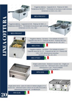Friggitrice elettrica - Capacità litri 8 - Potenza W 3000 - Temperatura 50/190°C - Termostato di sicurezza e spie luminose Dimensioni cm 26.5 x 41 x 35 h BES-FRI03002 LINEA COTTURA Friggitrice elettrica - Capacità litri 8+8 - Potenza W 3500 x 2 - Temperatura 50/190°C - Termostato di sicurezza e spie luminose Dimensioni cm 54 x 41 x 35 h BES-FRI03007 Friggitrice elettrica - Da banco - Con rubinetto di scarico - Capacità vasca litri 11 - Capacità olio litri 8 - Potenza kW 3.25 - Alimentazione monofase - Dimensioni cm 28 x 43 x 25 h MEC-FT8V Friggitrice elettrica - Da banco - Con rubinetto di scarico - Capacità vasca litri 11+ 11 - Capacità olio litri 8 +8 - Potenza kW 3.25 + 3.25 -Alimentazione monofase Dimensioni cm 56 x 43 x 25 h MEC-FT88V Griglia a pietra lavica - Struttura in acciaio inox - Griglia con tondino in acciaio inox - Dimensioni piano cottura 52x35 - Alimentazione a gas - Potenza 9000W Dimensioni cm 54x39x31 h MTK-GG9 Griglia pietra lavica - piano di cottura in lamiere piegate a V in acciaio inox - dimensioni piano cottura cm 31.2x48.3+31.2x48.3 alimentazione metano-gpl - cm 66x54x22h 20 FIR-GL66