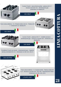 Cucina 2 fuochi - senza fiamma pilota - potenza kW 3.7 - struttura inacciaio inox - alimentazione gas Dimensioni cm 40x60x27h GIG-M62F Piano cottura elettrico - N. 4 Piastre tonde ø 18 cm -Potenza kW 7 - Dimensioni cm 60x60x27h GIG-M64P LINEA COTTURA Cucina 4 fuochi - potenza kW 3.7 - modello da banco - alimentazione gas - struttura in acciaio inox - Dimensioni cm 60x60x27h GIG-M64F Fornellone 5 fuochi con tavolo - Alimentazione gas - Capacità termica nominale kW 14.3 - Dimensioni cm 90 x 62 x 91.5 h EKA-EKTP96 Piano cottura elettrico - N. 6 piastre tonde - Potenza totale kW 11.5 - Struttura in acciaio inox AISI 304 - Alimentazione trifase - Dimensioni cm 100 x 60 x 28 h LTS-PC-10ET 21