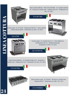 Piano cottura elettrico - Mod. E7CUET4BA - N. 4 piastre tonde ø 22 - Struttura in acciaio inox - Potenza kW 10.4 - Dimensioni cm 80 x 70 x 85 h LINEA COTTURA E7CUET4BA Cucina a gas - N. 6 Fuochi - Potenza da kW 22.2 - Vano a giorno - Senza fiamma pilota - Dimensioni cm 100 x 70 x 90 h GIG-M76F Cucina a gas - N. 4 fuochi da kw 3.7 - forno elettrico a convenzione GN 1/1 - alimentazione gas Dimensioni cm 80 x 70 x 90 h GIG-M74FFXE Piano cottura elettrico - N. 6 piastre tonde ø 22 - Struttura in acciaio inox - Potenza kW 15.6 - Dimensioni cm 120 x 70 x 85 h E7CUET6BA Piano cottura a gas - N. 6 fuochi - Struttura in acciaio inox - Potenza kW 27 - Dimensioni cm 105 x 70 x 27 h E7CUP6BB6M 24