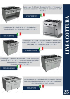 Cucina a gas - N. 6 fuochi - Bruciatori kw 4.5 x 6 - Vano a giorno Struttura in acciaio inox - Potenza kW 27 - Dimensioni cm 105 x 70 x 85 h E7CUPG6BA6M Cucina a gas - N. 6 fuochi da kw 3.7 - forno elettrico a convenzione GN 1/1 - Dimensioni cm 100 x 70 x 90 h GIG-M76FFXE LINEA COTTURA Cucina a gas - N. 4 fuochi - Bruciatori kW 4.5 x 4 - Forno a gas statico GN 2/1 cm 68.5 x 53 x 35 h - - Struttura in acciaio inox - Potenza kW 25.9 - Dimensioni cm 80 x 70 x 85 h E7KUPG4LO4M Cucina a gas - n. 6 fuochi - Bruciatori kW 4.5 x 6 - Forno a gas statico cm 54.5 x 53 x 35 h - - Struttura in acciaio inox - Vano neutrocon porta - Potenza totale kW 34.9 Dimensioni cm 105 x 70 x 85 h E7CUPG6FN6M Cucina elettrica - N. 6 piastre tonde ΓΈ 22 - Struttura in acciaio inox - Forno elettrico statico cm 54.5 x 53 x 35 h Potenza kW 21.6 - Dimensioni cm 120 x 70 x 85 h E7CUET6FE 25