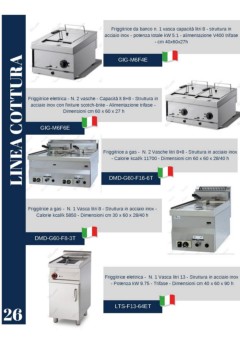 Friggitrice da banco n. 1 vasca capacità litri 8 - struttura in acciaio inox - potenza totale kW 5.1 - alimentazione V400 trifase - cm 40x60x27h LINEA COTTURA GIG-M6F4E Friggitrice elettrica - N. 2 vasche - Capacità lt 8+8 - Struttura in acciaio inox con finiture scotch-brite - Alimentazione trifase - Dimensioni cm 60 x 60 x 27 h GIG-M6F6E Friggitrice a gas - N. 2 Vasche litri 8+8 - Struttura in acciaio inox - Calorie kcal/k 11700 - Dimensioni cm 60 x 60 x 28/40 h DMD-G60-F16-6T Friggitrice a gas - N. 1 Vasca litri 8 - Struttura in acciaio inox - Calorie kcal/k 5850 - Dimensioni cm 30 x 60 x 28/40 h DMD-G60-F8-3T Friggitrice elettrica - N. 1 Vasca litri 13 - Struttura in acciaio inox - Potenza kW 9.75 - Trifase - Dimensioni cm 40 x 60 x 90 h 26 LTS-F13-64ET