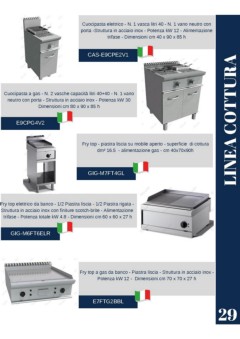 Cuocipasta elettrico - N. 1 vasca litri 40 - N. 1 vano neutro con porta -Struttura in acciaio inox - Potenza kW 12 - Alimentazione trifase - Dimensioni cm 40 x 90 x 85 h CAS-E9CPE2V1 Cuocipasta a gas - N. 2 vasche capacità litri 40+40 - N. 1 vano neutro con porta - Struttura in acciaio inox - Potenza kW 30 Dimensioni cm 80 x 90 x 85 h E9CPG4V2 LINEA COTTURA Fry top - piastra liscia su mobile aperto - superficie di cottura dm² 16.5 - alimentazione gas - cm 40x70x90h GIG-M7FT4GL Fry top elettrico da banco - 1/2 Piastra liscia - 1/2 Piastra rigata - Struttura in acciaio inox con finiture scotch-brite - Alimentazione trifase - Potenza totale kW 4.8 - Dimensioni cm 60 x 60 x 27 h GIG-M6FT6ELR Fry top a gas da banco - Piastra liscia - Struttura in acciaio inox - Potenza kW 12 - Dimensioni cm 70 x 70 x 27 h E7FTG2BBL 29