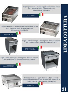 Griglia a pietra lavica - struttura e griglia con tondino in acciaio inox - Potenza W 9000 - Alimentazione a gas Dimensioni cm 35 x 53 x 31 h TKL-GPL90 Griglia a pietra lavica - struttura e griglia con tondino in acciaio inox - Potenza W 9000 - Alimentazione a gas Dimensioni cm 54 x 39 x 31 h TKL-GPL100 LINEA COTTURA Griglia a pietra lavica a gas - Vano a giorno - Struttura in acciaio inox - Potenza kW 8 - Dimensioni cm 40 x 70 x 85 h CAS-E7BS1BA Griglia a pietra lavica a gas - Vano a giorno - Struttura in acciaio inox - Potenza kW 16 - Dimensioni cm 80 x 70 x 85 h CAS-E7BS2BA Griglia a pietra lavica - griglie di cottura n. 6 (16 x 54 Cm) - Portata termica nominale 23 kW - Bruciatori n. 8 - Calorie 19.78 Kcal/h -Dim. Cm 114 x 70 x 38 h - Peso Kg 108 GM-B115 31