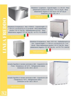 Abbattitore / surgelatore - Capacità teglie n. 3 x GN 2/3 - Resa abbattimento positivo in 90 minuti +70°+3° (Kg 8) - Resa abbattimento negativo in 240 minuti +70°-18° (Kg 5) Dimensioni cm 66 x 65 x 43 h FRCR-T3 LINEA FREDDO Abbattitore di temperatura - Mod. AT05ISO - Capacità teglie n. 5 x GN 1/1 ( cm 53x32.5) o N. 5 cm 60x40 - Resa abbattimento positivo +70°+3° (Kg 20) - Raffreddamento ad aria - Resa abbattimento negativo +70°-18° (Kg 15) - cm 75 x 74 x 85/88 h TCN-AT05ISO Abbattitore di temperatura - Mod. AT07 ISO - Raffreddamento ad aria - Capacità teglie n. 7 x GN 1/1 ( cm 53x32.5) o N. 7 cm 60x40 - Resa Abbattimento positivo +70°+3° (Kg 25) - Resa abbattimento negativo +70°-18° (Kg 15) - cm 75 x 74 x 130/132 TCN-AT07ISO Armadio frigorifero in lamiera verniciata e ABS - Capacità litri 120 - Porta - Temperatura -18°-22°C - Refrigerazione statica Dimensioni cm 60 x 58.5 x 85.5 h FRCR-EF200 FRCR-EF200 Armadio frigorifero in lamiera verniciata e ABS - Capacità litri 130 - Temperatura 2°+8°C - Refrigerazione statica Dimensioni cm 60 x 58.5 x 85.5 h FRCR-EF200 FRCR-ER200 32