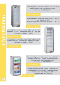 Armadio frigorifero in acciaio inox - Statico - Eco - N.1 porta in vetro- Capacità litri 350 - Temperatura +2º/+8ºC Dimensioni cm 60x58.5x185.5 h FRCR-ER400GSS LINEA FREDDO Armadi frigorifero in acciaio inox - Statico - Eco - N.1 porta in vetro -Capacità litri 350 Temperatura -18º/-22ºC - Dimensioni cm 60 x 58.5 x 185.5 h FRCR-EF400SSG Armadio frigorifero in lamiera verniciata e ABS - Capacità litri 340 Temperatura -18°-22°C - Refrigerazione statica - N. 1 porta vetro Dimensioni cm 60 x 58.5 x 185.5 h FRCR-EF400G Armadio frigorifero in lamiera verniciata e ABS - Capacità litri 350 Temperatura 2°+8°C - N.1 porta vetro - Refrigerazione statica - Dimensioni cm 60 x 58.5 x 185.5 h FRCR-ER400G Espositore refrigerato per bibite - Statico - Capacità litri 60 - Temperatura 0°C/+10°C - Struttura in plastica ed acciaio verniciato bianco - Gas Refrigerante R134A FRCR-EF200 Dimensioni cm 47,5x51,7x74,6 h MTK-AK60RG Espositore refrigerato per bibite - Statico - Capacità litri 100 - Temperatura 0°C/+10°C - Struttura in plastica ed acciaio verniciato bianco - Gas Refrigerante R134A FRCR-EF200 Dimensioni cm 47,5x51,7x101,7 h MTK-AK110RG 34
