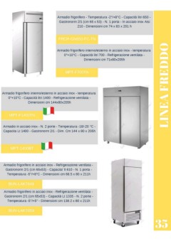 Armadio frigorifero - Temperatura -2°/+8°C - Capacità litri 650 - Gastronorm 2/1 (cm 65 x 53) - N. 1 porta - In acciaio inox Aisi 210 - Dimensioni cm 74 x 83 x 201 h FRCR-GN650-FC-TN Armadio frigorifero interno/esterno in acciaio inox - temperatura 0°+10°C - Capacità litri 700 - Refrigerazione ventilata - Dimensioni cm 71x80x205h MPT-F700TN Armadio frigorifero interno/esterno in acciaio inox - temperatura LINEA FREDDO 0°+10°C - Capacità litri 1400 - Refrigerazione ventilata - Dimensioni cm 144x80x205h MPT-F1400TN Armadio in acciaio inox - N. 2 porte - Temperatura -18/-20 °C - Capacita Lt 1400 - Gastronorm 2/1 - Dim. Cm 144 x 80 x 205h MPT-1400BT Armadio frigorifero in acciaio inox - Refrigerazione ventilata - Gastronorm 2/1 (cm 65x53) - Capacita' lt 610 - N. 1 porta - Temperatura -5°/+8°C - Dimensioni cm 68.5 x 80 x 211h BUN-LAK7849 Armadio frigorifero in acciao inox - Refrigerazione ventilata - Gastronorm 2/1 (cm 65x53) - Capacità Lt 1335 - N. 2 porte - Temperatura -5°/+5° - Dimensioni cm 138.2 x 80 x 211h BUN-LAK7859 35