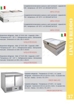 Congelatore/conservatore a pozzo a vetri scorrevoli - capacità litri 529 - temperatura -18°-25°C- cm 155.8x97.8x75.3h MFG-VT150 Congelatore/conservatore a pozzo a vetri scorrevoli - capacità litri 753 - temperatura -18°-25°C- cm 205.8x97.8x75.3h MFG-VT200 Congelatore/conservatore a pozzo a vetri scorrevoli - capacità litri 976 - temperatura -18°-25°C- cm 255.8x97.8x75.3h MFG-VT250 Espositore refrigerato - Mod. GT EVO 150 - Capacità Lt 564 - Temperatura-18° / -25° C - Refrigerazione statica - Sbrinamento LINEA FREDDO manuale - Dimensioni cm 150 x 94.4 x 83.8 h UCQ-GTEVO150 Espositore refrigerato - Mod. GT EVO 200 - Capacità Lt 808 - Temperatura-18° / -25° C - Refrigerazione statica - Sbrinamento manuale - Dimensioni cm 200 x 94.4 x 83.8 h UCQ-GTEVO200 Espositore refrigerato - Mod. GT EVO 250 - Capacità Lt 1037 - Temperatura -18° / -25° C - Refrigerazione statica - Sbrinamento manuale- Dimensioni cm 250 x 94,4 x 83,8 h UCQ-GTEVO250 Saladette refrigerata - Temperatura +2°/+8°C - N. 2 porte refrigerate - Gastronorm GN 1/1 (cm 53 x 32.5) - In acciaio inox Aisi 210 - Statica - Cm 90 x 70 x 87 h FRCF-S901-FC Saladette refrigerata - Temperatura +2°/+8°C - N. 3 porte refrigerate - Gastronorm GN 1/1 (cm 53 x 32.5) - In acciaio inox Aisi 210 - Statica - Cm 136.5 x 70 x 87 h FRCR-S903TOP-FC 37