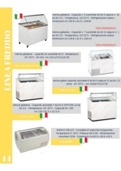 Vetrina gelateria - Capacità n. 5 vaschette da litri 5 oppure n. 10 da litri 2.5 - Temperatura -12/-22°C - Refrigerazione statica - Dimensioni cm 100.9 x 61.5 x 129.6h TER-PRIMERA5 LINEA FREDDO Vetrina gelateria - Capacità n. 7 vaschette da litri 14 oppure n. 1 da litri 2.5 - Temperatura -12/-22°C - Refrigerazione statica - Dimensioni cm 129.8 x 61.5 x 129.6 h TER-PRIMERA7 Vetrina gelateria - capacità 10 vaschette litri 5 - temperatura -15°-20°C - litri 431- cm 134.1x72.5x123.5h MFG-SLANT510ICE Vetrina gelati capacità vaschette 6 da litri 5 oppure 12 da litri 2.5 - temp. -15°-20°C - cm 120x67.5x117.5h MFG-TOP6 Vetrina gelateria - Capacità vaschette 7 da litri 5 OPPURE 14 da litri 2.5 - Temperatura -15°-20°C - Capacità litri 293 cm 135 x 67.3 x 117.5 h MFG-TOP7 BANCO GELATI - Completo di coperchio trasparente - Temperatura 0°-18°C -Potenza kW 0.50 - Alimentazione monofase V230 - Dimensioni cm 92.5 x 50.5 x 62 h TCR-BABY 44