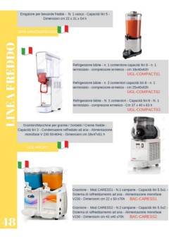 Erogatore per bevande fredde - N. 1 vasca - Capacità litri 5 - Dimensioni cm 22 x 31 x 54 h SPM-MINIDISPENSER LINEA FREDDO Refrigeratore bibite - n. 1 contenitore capacità litri 8 - n. 1 termostato - compressore ermetico - cm 18x40x63h UGL-COMPACT81 Refrigeratore bibite - n. 2 contenitori capacità litri 8 - n. 1 termostato - compressore ermetico - cm 25x40x63h UGL-COMPACT82 Refrigeratore bibite - N. 3 contenitori - Capacità litri 8 - N. 1 termostato - compresore ermetico - Cm 37 x 40 x 63 h UGL-COMPACT83 Granitori/Macchine per granite / Sorbetti / Creme fredde - Capacità litri 3 - Condensatore raffredato ad aria - Alimentazione monofase V 230 50-60Hz - Dimensioni cm 18x47x51 h UGL-MICRO Granitore - Mod.CARESS1 - N.1 campane - Capacità litri 5.5x1 - Sistema di raffreddamento ad aria - Alimentazione monofase V230 - Dimensioni cm 22 x 50 x70h BAC-CARESS1 Granitore - Mod.CARESS2 - N.2 campane - Capacità litri 5.5x2 - Sistema di raffreddamento ad aria - Alimentazione monofase 48 V230 - Dimensioni cm 43 x40 x70h BAC-CARESS2
