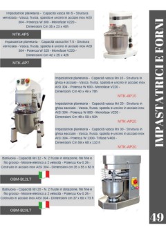 Impastatrice planetaria - Capacità vasca litri 5 - Struttura verniciata - Vasca, frusta, spatola e uncino in acciaio inox AISI 304 - Potenza W 300 - Monofase V220 - Dimensioni Cm 35 x 23 x 40h MTK-AP5 Impastatrice planetaria - Capacità vasca litri 7.5 - Struttura verniciata - Vasca, frusta, spatola e uncino in acciaio inox AISI 304 - Potenza W 325 - Monofase V220 - Dimensioni Cm 42 x 25 x 42h MTK-AP7 Impastatrice planetaria - Capacità vasca litri 10 - Struttura in ghisa e acciaio - Vasca, frusta, spatola e uncino in acciaio inox IMPASTATRICI E FORNI AISI 304 - Potenza W 600 - Monofase V220 - Dimensioni Cm 40 x 49 x 78h MTK-AP10 Impastatrice planetaria - Capacità vasca litri 20 - Struttura in ghisa eacciaio - Vasca, frusta, spatola e uncino in acciaio inox AISI 304 - Potenza W 900 - Monofase V220 - Dimensioni Cm 48 x 59 x 93h MTK-AP20 Impastatrice planetaria - Capacità vasca litri 30 - Struttura in ghisa eacciaio - Vasca, frusta, spatola e uncino in acciaio inox AISI 304 - Potenza W 1300- Trifase V400 - Dimensioni Cm 59 x 68 x 110 h MTK-AP30 Battiuova - Capacità litri 12 - N. 2 fruste in dotazione, filo fine e filo grosso - Motore elettrico a 2 velocità - Potenza Kw 0.26 - Costruito in acciaio inox AISI 304 - Dimensioni cm 35 x 55 x 63 h OBM-B12LT Battiuova - Capacità litri 20 - N. 2 fruste in dotazione, filo fine e filo grosso - Motore elettrico a 2 velocità - Potenza Kw 0.26 - Costruito in acciaio inox AISI 304 - Dimensioni cm 37 x 60 x 73 h OBM-B20LT 49