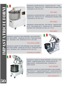 Impastatrice a spirale testa fissa - Capacità vasca litri 7 - Peso impasto Kg 5 - Potenza Kw 0.37 - Alimentazione monofase V230 IMPASTATRICI E FORNI - Dimensioni cm 24 x 50 x 50 h PRF-IMB5 IImpastatrice a spirale testa fissa - Capacità vasca litri 10 - Peso impasto Kg 8 - Potenza Kw 0.37 - Alimentazione monofase V230 - Dimensioni cm 26 x 50 x 50 h PRF-IMB10 Impastatrice a spirale testa fissa - Mod. IBM 20 - Capacità vasca litri 22 - Peso impasto Kg 17 - Potenza Kw 0.75 - Alimentazione monofase V230 -Dimensioni cm 38.5 x 67 x 72.5 h PRF-IMB20 Impastatrice a spirale con testa sollevabile e vasca removibile - Mod. IM5S-230RIB - Impasto per ciclo Kg.5 - Produzione oraria Kg.5 - Monofase V 230 - Dimensioni cm 47,5 x 26 x 39 h FGM-IM5S-230RIB Impastatrice a spirale con testa sollevabile e vasca removibile- Mod. M10S-230RIB - Impasto per ciclo Kg.10 - Produzione oraria Kg.30 - Monofase V 230 - Dimensioni cm 53 x 30 x 43 h FGM-IM10S-230RIB Impastatrice a spirale con testata sollevabile e vasca fissa - Mod. TS60AD - Capacità impasto kg 60 - Volume vasca litri 75 - Doppia velocità - Alimentazione trifase - Dimensioni cm 102x57.5x101h MCS-TS60AD Impastatrice a spirale con testata sollevabile e vasca estraibile - Mod.TS44A-M-T - Capacità impasto kg 44 - Volume vasca litri 50 - alimentazione monofase/trifase - Dimensioni cm 87.8 x 53 x 71 h MCS-TS44A-M-T 50