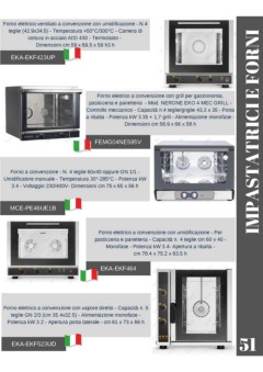 Forno elettrico ventilato a convenzione con umidificazione - N.4 teglie (42,9x34,5) - Temperatura +50°C/300°C - Camera di cottura in acciaio AISI 430 - Termostato - Dimensioni cm 59 x 69,5 x 59 h3 h EKA-EKF423UP Forno elettrico a convenzione con grill per gastronomia, pasticceria e panetteria - Mod. NERONE EKO 4 MEC GRILL - Controllo meccanico - Capacità n.4 teglie/griglie 43,3 x 35 - Porta a ribalta - Potenza kW 3.35 + 1,7 grill - Alimentazione monofase - Dimensioni cm 58,9 x 66 x 58 h IMPASTATRICI E FORNI FEMG04NE595V Forno a convenzione - N. 4 teglie 60x40 oppure GN 1/1 - Umidificatore manuale - Temperatura 30°-285°C - Potenza kW 3.4 - Voltaggio 230/400V- Dimensioni cm 75 x 65 x 56 h MCE-PE46UE1B Forno elettrico a convenzione con umidificazione - Per pasticceria e panetteria - Capacità n. 4 teglie cm 60 x 40 - Monofase - Potenza kW 3.4- Apertura a ribalta - cm 78.4 x 75.2 x 63.5 h EKA-EKF464 Forno elettrico a convenzione con vapore diretto - Capacità n. 5 teglie GN 2/3 (cm 35.4x32.5) - Alimentazione monofase - Potenza kW 3.2 - Apertura porta laterale - cm 61 x 73 x 66 h 51 EKA-EKF523UD