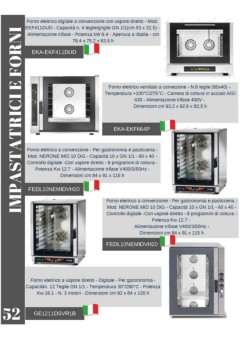 Forno elettrico digitale a convenzione con vapore diretto - Mod. EKF411DUD - Capacità n. 4 teglie/griglie GN 1/1(cm 53 x 32.5) - IMPASTATRICI E FORNI Alimentazione trifase - Potenza kW 6.4 - Apertura a ribalta - cm 78.4 x 75.2 x 63.5 h EKA-EKF411DUD Forno elettrico ventilato a convezione - N.6 teglie (60x40) - Temperatura +100°C/275°C - Camera di cottura in acciaio AISI 430 - Alimentazione trifase 400V - Dimensioni cm 93,2 x 92.6 x 82,5 h EKA-EKF664P Forno elettrico a convenzione - Per gastronomia e pasticceria - Mod. NERONE MID 10 DIG - Capacità 10 x GN 1/1 - 60 x 40 - Controllo digitale -Con vapore diretto - 9 programmi di cottura - Potenza Kw 12.7 - Alimentazione trifase V400/3/50Hz - Dimensioni cm 84 x 91 x 115 h FEDL10NEMIDVH20 Forno elettrico a convenzione - Per gastronomia e pasticceria - Mod. NERONE MID 10 DIG - Capacità 10 x GN 1/1 - 60 x 40 - Controllo digitale -Con vapore diretto - 9 programmi di cottura - Potenza Kw 12.7 - Alimentazione trifase V400/3/50Hz - Dimensioni cm 84 x 91 x 115 h FEDL10NEMIDVH20 Forno elettrico a vapore diretto - Digitale - Per gastronomia - Capacitàn. 12 Teglie GN 1/1 - Temperatura 30°/260°C - Potenza Kw 16.1 - N. 3 motori - Dimensioni cm 92 x 84 x 120 h 52 GE1211DSVR1B
