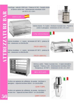 Centrifuga - velocità 6300 rpm - Potenza W 240 - Cestello dotato di lame e colino inox - alimentazione monofase V230 - cm 20.5 x 31 x 36 h ATTREZZATURE BAR SAM-LI-240 Vetrina neutra - N. 2 piani - Struttura in acciaio inox - Fianchi e antine in plexiglass - Dimensioni cm 50 x 35 x 34 h CFM-VEN520INOX Vetrina riscaldata - n. 1 piano - termostato 30° 90°C - potenza W 250 - dimensioni cm 50x35x25h FRCR-VBR4751 Vetrina riscaldata - n. 1 piano - termostato 30° 90°C - potenza W 400 - dimensioni cm 85x35x25h TAC-7020121002B FRCR-VBR4781 Vetrina a caldo - Telaio in acciaio inox - 4 ripiani estraibili e regolabili - Potenza 1 kW - Alimentazione monofase 230V - Temperatura: 30°/90°C - Dimensioni cm 64 x 34 x 56 h BES-VET01655 Frullino con agitatore da caffetteria da parete - bicchiere in plexiglass - capacità bicchiere 500ml - cm 10x15x280h QUM-T1BPL Frullino con agitatore da caffetteria da parete - bicchiere in acciaio inox - capacità bicchiere 500ml - cm 10x15x280h 56 QMR-T1INOX