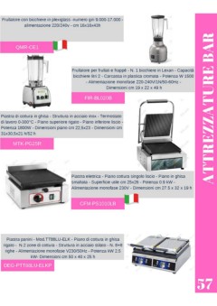 Frullatore con bicchiere in plexiglass -numero giri 9.000-17.000 - alimentazione 220/240v - cm 16x16x43h QMR-CE1 Frullatore per frullati e frappè - N. 1 bicchiere in Lexan - Capacità bicchiere litri 2 - Carcassa in plastica cromata - Potenza W 1500 - Alimentazione monofase 220-240V/1N/50-60Hz - Dimensioni cm 19 x 22 x 49 h FIR-BL020B Piastra di cottura in ghisa - Struttura in acciaio inox - Termostato ATTREZZATURE BAR di lavoro 0-300°C - Piano superiore rigato - Piano inferiore liscio - Potenza 1800W - Dimensioni piano cm 22,5x23 - Dimensioni cm 31x30,5x21 h/52 h MTK-PG25R TAC-7020121002B Piastra elettrica - Piano cottura singolo liscio - Piano in ghisa smaltata - Superficie utile cm 25x26 - Potenza 0.9 kW - Alimentazione monofase 230V - Dimensioni cm 27.5 x 32 x 19 h CFM-PS1010LB Piastra panini - Mod.TT88LU-ELK - Piano di cottura in ghisa rigato - N.2 zone di cottura - Struttura in acciaio stilato - N. 8+8 righe - Alimentazione monofase V230/50Hz - Potenza kW 2.5 TAC-7020121002B kW- Dimensioni cm 50 x 40 x 25 h DEG-PTT88LU-ELKP 57 TAC-7020121002C