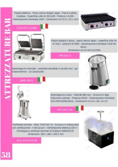 Piastra elettrica - Piano cottura doppio rigato - Piano in ghisa smaltata - Superficie utile cm 50.5x26 - Potenza 1.8 kW - ATTREZZATURE BAR Alimentazione monofase 230V - Dimensioni cm 51.5 x 32 x 19 h CFM-PD1020RB Piastra doppia in ghisa - piano cottura rigato - superficie utile cm 47.5x23 - potenza W 3600 - alimentazione monofase V230 50- 60Hz - Dimensioni cm 57x30.5x21/50h FIR-EG03 Spremiagrumi manuale - vaschetta estraibile in acciaio inox - giri motore 80/min - cm 20x20x26h QMR-SE01 TAC-7020121002B Spremiagrumi a leva - Velocità 980 rpm - struttura in lega d'alluminio satinato - Potenza W230 - Alimentazione monofase 220-240V/1N/50-60Hz - Dimensioni cm 22 x 29 x 41.5 h FIR-SM-CJ6 Raffredda bicchieri - Mod. FANTASY B - Struttura in metracrilato con certificazione - 4 led azzurri - Alimentazione elettrica 220 V - Omologata e cerificata secondo la Direttiva 2006/42/CE - Dimensioni: 250 x 180 x 240 h mm TAC-7020121002B GLE-FANTASYB 58 TAC-7020121002C
