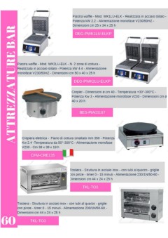 Piastra waffle - Mod. WK1LU-ELK - Realizzata in acciaio stilato - Potenza kW 2.2 - Alimentazione monofase V230/50HZ - Dimensioni cm 25 x 34 x 25 h ATTREZZATURE BAR DEG-PWK1LU-ELKP Piastra waffle - Mod. WK2LU-ELK - N. 2 zone di cottura - Realizzata in acciaio stilato - Potenza kW 4.4 - Alimentazione monofase V230/50HZ - Dimensioni cm 50 x 40 x 25 h DEG-PWK2LU-ELKP Crepier - Dimensioni ø cm 40 - Temperatura +30°-300°C - Potenza Kw 3 - Alimentazione monofase V230 - Dimensioni cm ø 40 x 20 h BES-PIA03187 TAC-7020121002B Crepiera elettrica - Piano di cottura smaltato mm 350 - Potenza Kw 2.4 -Temperatura da 50°-300°C - Alimentazione monofase V230 - Cm 38 x 38 x 19 h CFM-CRE135 Tostiera - Struttura in acciaio inox - con tubi al quarzo - griglie con pinze - timer 0 - 15 minuti - Alimentazione 230/1N/50-60 - Dimensioni cm 44 x 24 x 25 h TAC-7020121002B TKL-TO3 Tostiera - Struttura in acciaio inox - con tubi al quarzo - griglie con pinze - timer 0 - 15 minuti - Alimentazione 230/1N/50-60 - Dimensioni cm 44 x 24 x 25 h 60 TKL-TO3