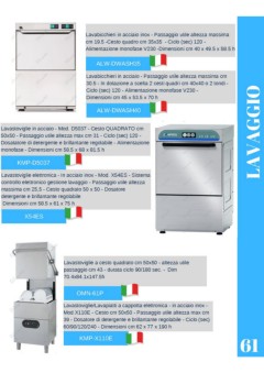 Lavabicchieri in acciaio inox - Passaggio utile altezza massima cm 19.5 -Cesto quadro cm 35x35 - Ciclo (sec) 120 - Alimentazione monofase V230 -Dimensioni cm 40 x 49.5 x 58.5 h ALW-DWASH35 Lavabicchieri in acciaio - Passaggio utile altezza massima cm 30.5 - In dotazione a scelta 2 cesti quadri cm 40x40 o 2 tondi - Ciclo (sec) 120 - Alimentazione monofase V230 - Dimensioni cm 45 x 53.5 x 70 h ALW-DWASH40 Lavastoviglie in acciaio - Mod. D5037 - Cesto QUADRATO cm 50x50 - Passaggio utile altezza max cm 31 - Ciclo (sec) 120 - LAVAGGIO Dosatatore di detergente e brillantante regolabile - Alimentazione monofase - Dimensioni cm 58.5 x 68 x 81.5 h KMP-D5037 Lavastoviglie elettronica - In acciaio inox - Mod. X54ES - Sistema controllo elettronico gestione lavaggio - Passaggio utile altezza massima cm 25,5 - Cesto quadrato 50 x 50 - Dosatore detergente e brillantante regolabile Dimensioni cm 58.5 x 61 x 75 h X54ES Lavastoviglie a cesto quadrato cm 50x50 - altezza utile passaggio cm 43 - durata ciclo 90/180 sec. - Dim 70.4x84.1x147.5h OMN-61P Lavastoviglie/Lavapiatti a cappotta elettronica - in acciaio inox - Mod.X110E - Cesto cm 50x50 - Passaggio utile altezza max cm 39 - Dosatore di detergente e brillantante regolabile - Ciclo (sec) 60/90/120/240 - Dimensioni cm 62 x 77 x 190 h 61 KMP-X110E