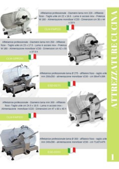 Affettatrice professionale - Diametro lama mm 220 - Affilatoio fisso - Taglio utile cm 22 x 16.5 - Lama in acciaio inox - Potenza W 160 - Alimentazione monofase V230 - Dimensioni cm 36 x 44 x 33 h CLM-FAP220 Affettatrice professionale - Diametro lama mm 250 - Affilatoio fisso - Taglio utile cm 23 x 17.5 - Lama in acciaio inox - Potenza W 180 - Alimentazione monofase V230 - Dimensioni cm 42 x 55 x 37.5 h CLM-GPR250 ATTREZZATURE CUCINA Affettatrice professionale lama Ø 275 - affilatoio fisso - taglio utile mm 200x250 - alimentazione monofase V230 - cm 58x47x39h ESD-D275 Affettatrice professionale - Diametro lama mm 300 - Affilatoio fisso -Taglio utile cm 24.5 x 19.5 - Lama in acciaio inox - Alimentazione monofase V220 - Dimensioni cm 47 x 60 x 45 h CLM-FAP300 Affettatrice professionale lama Ø 350 - affilatoio fisso - taglio utile mm 240x290 - alimentazione monofase V230 - cm 71x57x47h ESD-D350 1