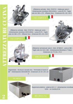 ATTREZZATURE CUCINA Affettatrice verticale - Mod. 37AIPVS - Adatta per salumi - Alimentazione monofase 230V/1/50Hz - Lama Ø 370 - Taglio utile mm 290 x 275 - Affilatoio fisso - Dimensioni 65 x 82 x 64 h FAC-37AIPVS-S Affettatrice verticale - Mod. 37AIPVS - Adatta per carne - Alimentazione monofase 230V/1/50Hz - Lama Ø 370 - Taglio utile mm 290 x 275 - Affilatoio fisso - Dimensioni 65 x 82 x 64 h FAC-37AIPVS-C Affettatrice verticale per salumi - Mod. AF380VS - Lama ø 380 - Taglio utile mm 310 x 260 - Alimentazione Monofase o Trifase - Dimensioni cm 77x 64 x 74 H SWE-AF380VS Bagnomaria - Struttura in acciaio inox - Termostato di lavoro 0- 90° - Alimentazione 230/1N/50-60 - Dimensioni cm 34 x 54 x 25 h TKL-BM16 Bagnomaria elettrico - potenza kW 1.2 - alimentazione monofase V230 - cm 34x55x23.5h ESD-D350 2 BES-BAG01721