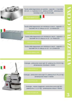 Tavola calda bagnomaria con pentola - capacità n. 1 bacinella GN 1//1 - n. 2 pentola lt 4+4 - potenza W1200 - alimentazione monofase V230 - cm 57x37x28h FRCR-BMP7720 Tavola calda bagnomaria con resistenza a secco - capacità n. 1 bacinella GN 1/1 altezza cm 20 - cm 49x60x32h FRCR-BMS1781 Tavola calda bagnomaria con resistenza a secco - capacità n. 2 ATTREZZATURE CUCINA bacinelle GN 1/1 altezza cm 20 - cm 78x60x32h SWE-AF380VS FAC-37AIPVS-C FRCR-BMS1783 Tavola calda bagnomaria con resistenza a secco - capacità n. 3 bacinelle GN 1/1 altezza cm 20 - cm 110x60x32h SWE-AF380VS FAC-37AIPVS-C FRCR-BMS1785 Grattugia - produzione oraria kg/h 30 -potenza Kw 3.8 (0,5 Hp) - alimentazione monofase V 230/50 FAM-FGM113 Grattugia - produzione oraria kg/h 70 -potenza Kw 0.75 (1.0 Hp) - alimentazione trifase V 400/50 FAM-FGS106 Grattugia - motore maggiorato -produzione oraria kg/h 90 - potenza Kw 1.1 (1.5 Hp) - alimentazione trifase V 400/50 3 FAM-FGSM106